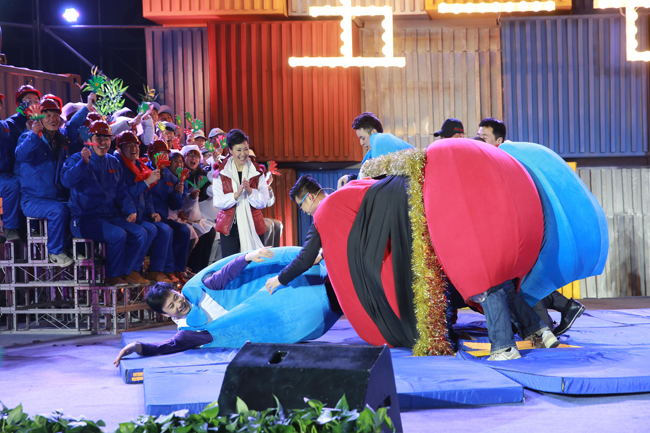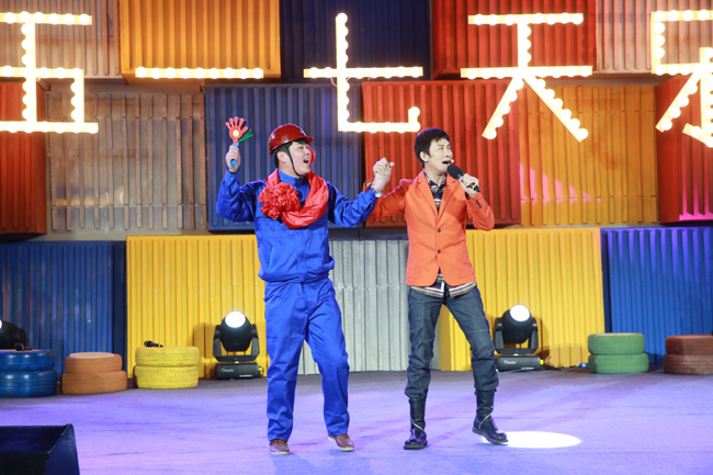 本次《五一七天樂》節(jié)目的主題是“五一七天樂,勞動更快樂”。節(jié)目在獨具勞動特色的開場舞《最炫民族風(fēng)》中拉開演出序幕,于文華、管彤推著小推車出場,車上的大箱子引起了觀眾們的好奇。正當(dāng)觀眾遺憾和猜測禮物是什么的時候,老畢出奇意外地從箱子里出來,這份始料未及的“大禮”頓時引起了現(xiàn)場觀眾一陣歡呼。隨后其他嘉賓分別騎玩具小車登臺,《五一七天樂》節(jié)目開始。節(jié)目以比賽的形式進行,眾位嘉賓分成“紅薯”和“拔絲”倆隊,現(xiàn)場比拼才藝。