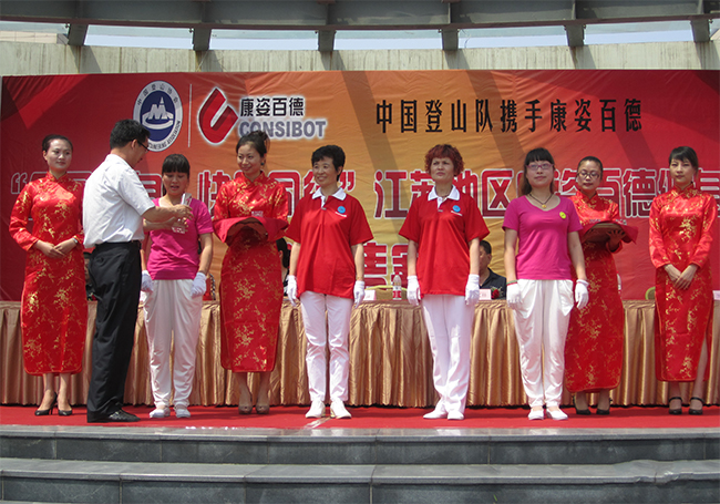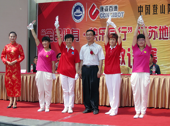 5月25日上午11時,中國登山隊攜手康姿百德舉辦的“全民健身·快樂同行”康姿百德第二套健身操邀請賽江蘇地區(qū)比賽在江蘇太倉舉行。來自江蘇各地區(qū)的18個代表隊共計600余名健身愛好者參加了此次比賽。 參加此次比賽的主要嘉賓有:中國登山協(xié)會副會長楊文祥、原張家港工商局局長焦兀、太倉市城廂鎮(zhèn)工商分局書記楊振華、太倉市保護(hù)消費者協(xié)會秘書長鄒雁、太倉曲藝指導(dǎo)委員會秘書長徐兆群、康姿百德公司董事長、總經(jīng)理李銀祥等。 中國登山隊攜手康姿百德“全民健身·快樂同行”大型公益活動,于2012年在全國開展以來,受到了社會各方面的廣泛關(guān)注。為了將“全民健身·快樂同行”大型公益活動進(jìn)一步引向深入,讓更多的人走出家門,參加全民健身運動,中國登山隊,秦皇島康姿百德高新技術(shù)開發(fā)有限公司,決定聯(lián)合舉辦“全民健身·快樂同行”康姿百德健身操邀請賽,江蘇地區(qū)是本次邀請賽初賽的第一站。 在比賽中,身著紅色演出服的青年歌手楊德朗站在車上出場,演唱了他的原創(chuàng)歌曲《最美中國人》。這首歌曲是康姿百德第二套健身操的背景音樂之一,全體參賽的健身愛好者隨著音樂而舞動,統(tǒng)一的著裝、整齊的動作、飽滿的熱情,將本次比賽推向了高潮。 經(jīng)評比,18個代表隊分獲“最佳表演獎”、“團(tuán)隊建設(shè)獎”、“最佳組織獎”等獎項,這些健身操愛好者將在9月份來到秦皇島參加“全民健身·快樂同行”康姿百德健身操邀請賽的展演,勢將引起新一輪的康姿百德健身熱潮。