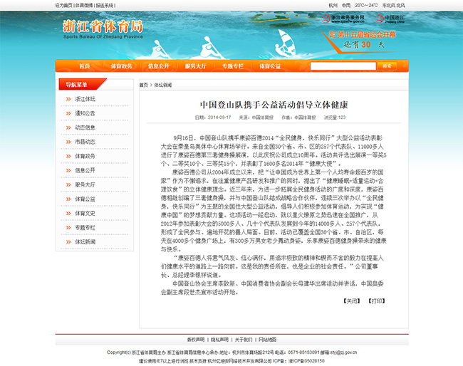 浙江體育局官網(wǎng)以《中國(guó)登山隊(duì)攜手公益活動(dòng)倡導(dǎo)立體健康》為題,對(duì)2014“全民健身 快樂(lè)同行”大型公益活動(dòng)表彰大會(huì)進(jìn)行報(bào)道。