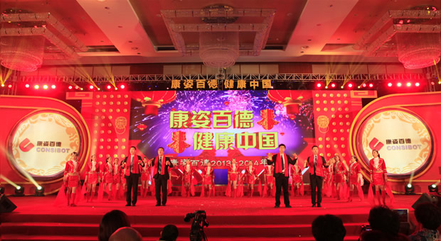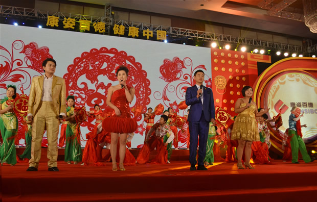 中午1時(shí)許,從全國(guó)各地趕來(lái)參加年會(huì)的經(jīng)銷商蜂擁而至。會(huì)場(chǎng)門前,由公司督導(dǎo)師組成的禮儀隊(duì),身著禮服,面帶微笑,列隊(duì)歡迎大家的到來(lái),一句句“過(guò)年好”、“歡迎您回家”、“您辛苦了”的問(wèn)候聲不絕于耳。會(huì)場(chǎng)內(nèi),由公司員工自己搭建的舞臺(tái)燈光閃爍,絢麗多彩,懸掛于舞臺(tái)兩側(cè)的大紅燈籠顯得格外耀眼;舞臺(tái)背景的LED屏幕上,“康姿百德、健康中國(guó)”、“康姿百德2013-2014年會(huì)”等字幕交替顯示;偌大的大廳內(nèi),40張餐桌上擺滿了水果、瓜子、花生、飲料……。大家邊吃邊聊,噓寒問(wèn)暖,徜徉在幸福和愉悅之中,盡情享受著家一般的親切和溫暖。