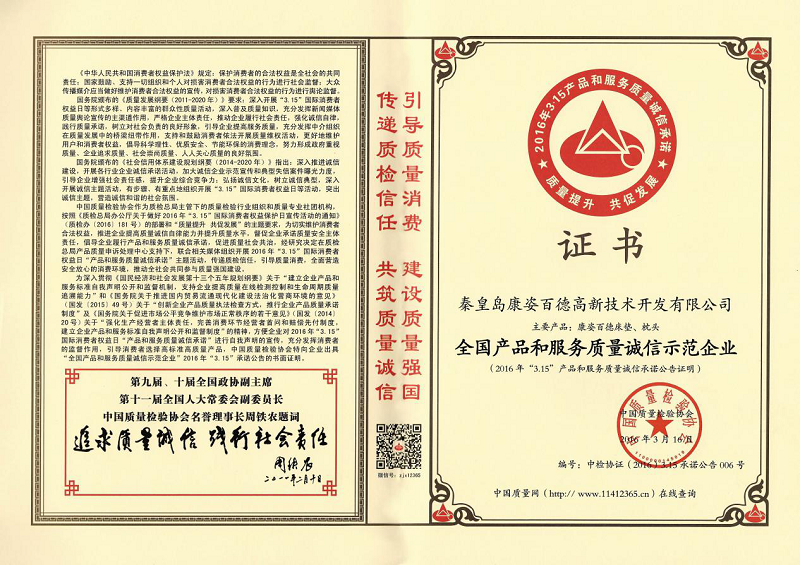 康姿百德與中國工商銀行、蘇寧云商、國美、京東等企業(yè)一起,榮獲2016年3.15“重質(zhì)守信 優(yōu)質(zhì)服務(wù) 維權(quán)信譽(yù)單位”榮譽(yù)稱號。2016年3月27日,中國誠信維權(quán)網(wǎng)對獲此殊榮的企業(yè)予以公示。(http://www.cc315.org.cn/context.asp?id=2563)