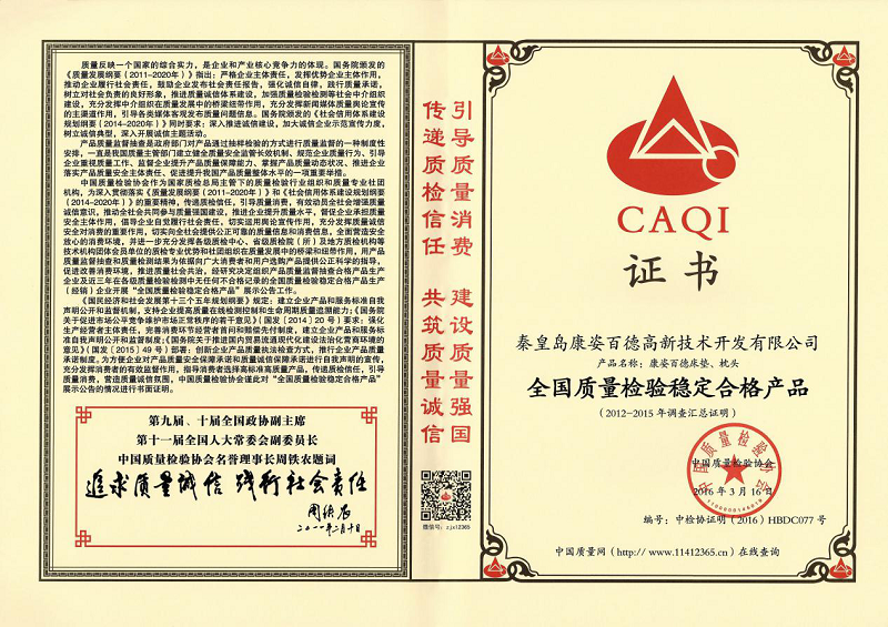 此外,康姿百德還分別榮獲3.15主題活動中“全國產(chǎn)品和服務(wù)質(zhì)量誠信示范企業(yè)”、“全國質(zhì)量檢驗(yàn)穩(wěn)定合格產(chǎn)品”兩項(xiàng)榮譽(yù)。