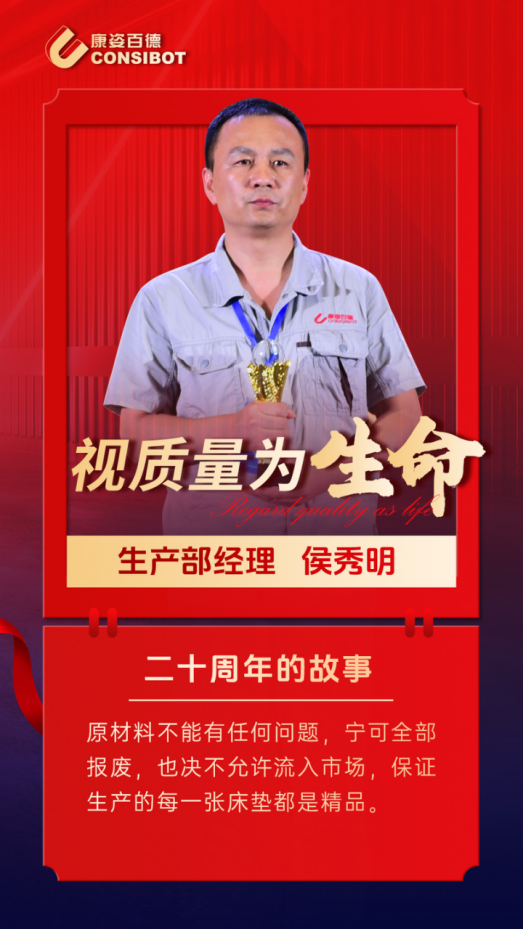 今年是康姿百德集團成立20周年。在20年的發(fā)展歷程中,涌現(xiàn)出一大批在生產(chǎn)發(fā)展、原料采購、質(zhì)量管控、經(jīng)營管理、售后服務(wù)等各個領(lǐng)域立足崗位、奉獻建功的優(yōu)秀代表。讓我們一起看看這些榜樣故事。本期帶你走進康姿百德生產(chǎn)部經(jīng)理侯秀明。