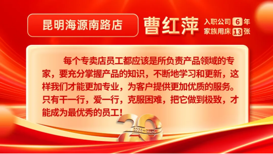 今年是康姿百德集團(tuán)成立20周年。在20年的發(fā)展歷程中,有這樣一群人,他們?cè)谑袌?chǎng)經(jīng)營(yíng)管理過(guò)程中,深刻貫徹以客戶為中心的理念,始終把優(yōu)質(zhì)的服務(wù)融于門(mén)店經(jīng)營(yíng)的每個(gè)環(huán)節(jié),也因此得到了客戶的贊賞和認(rèn)可。他們就是康姿百德專賣店的員工。本期和您分享的是康姿百德云南地區(qū)和廣東地區(qū)專賣店員工代表的故事。