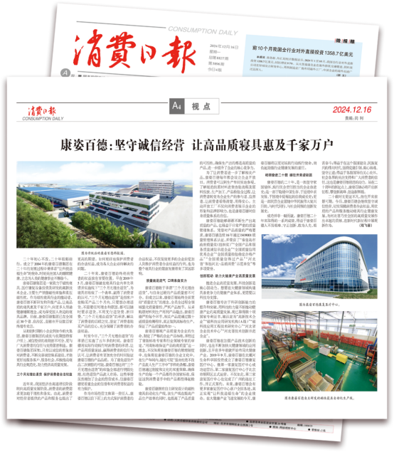 《消費(fèi)日報》由國務(wù)院國有資產(chǎn)監(jiān)督管理委員會舉辦,中國輕工業(yè)聯(lián)合會主管主辦,是我國消費(fèi)領(lǐng)域中一張全國性、全方位、大容量的綜合性日報。其立足消費(fèi)領(lǐng)域,依托輕工行業(yè),面向城鄉(xiāng)市場,最先發(fā)布相關(guān)的專業(yè)權(quán)威信息以及消費(fèi)景氣預(yù)報。近日,消費(fèi)日報以《康姿百德:堅守誠信經(jīng)營 讓高品質(zhì)寢具惠及千家萬戶》為題,對康姿百德進(jìn)行了專題報道。
