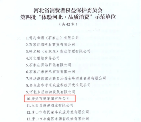 康姿百德集團被評為河北省“‘體驗河北·品質(zhì)消費’示范單位”