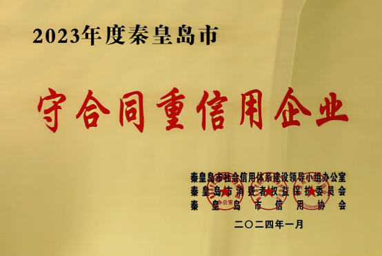 康姿百德集團榮獲“秦皇島市守合同重信用企業(yè)”、“秦皇島市信用協(xié)會 第一屆理事會副會長單位”榮譽稱號