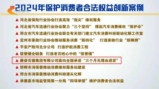 2025年3月15日,康姿百德集團有限公司面向全國承諾“三個月無理由退貨”成功入選河北省消保委評選的“2024年保護消費者合法權(quán)益創(chuàng)新案例”,并被河北省消保委作為典范,向全社會推廣。