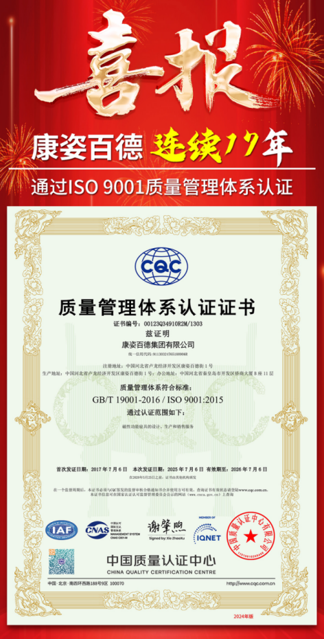 憑借過(guò)硬的質(zhì)量管理實(shí)力、完善的質(zhì)量管理體系、高效精細(xì)化的管理模式,康姿百德再次通過(guò)了ISO 9001質(zhì)量管理體系認(rèn)證。這也是康姿百德連續(xù)17年通過(guò)該質(zhì)量管理體系的認(rèn)證和再認(rèn)證。