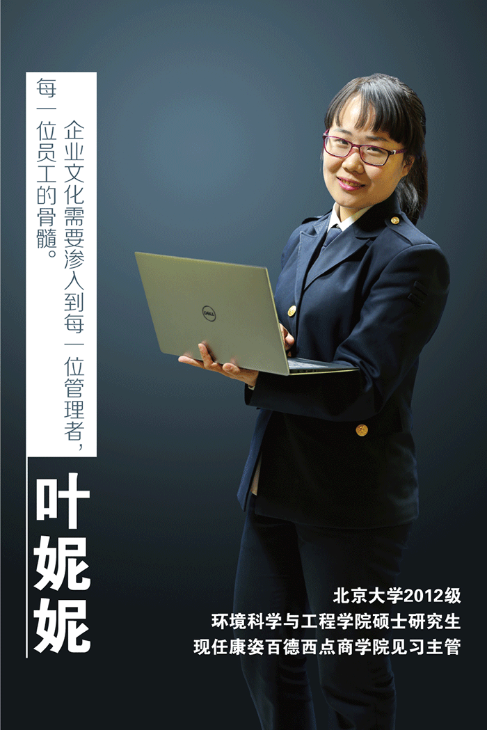 葉妮妮,北京大學(xué)2012級環(huán)境科學(xué)與工程學(xué)院碩士研究生,現(xiàn)任康姿百德西點(diǎn)商學(xué)院見習(xí)主管。